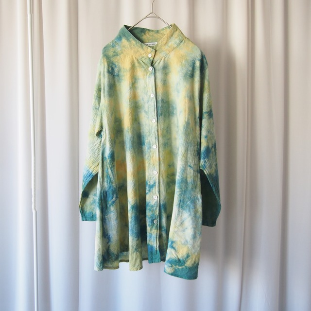 ジャガードスタンドカラーブラウス 草木染め(植物染料:インド藍、ロッグウッド、マリーゴールド) 【こちらの洋服について】 草木に囲まれた工房で、一枚一枚丁寧に手染めを施しました。自然な色合いと、手仕事ならではのやさしく奥行きのある風合いを大切にしています。 光を受けるとうっすらと模様が浮かび上がる、上品なジャガード生地を使用。首元までやさしく包み込むスタンドカラーで、落ち着いた印象に仕上げました。裾に向かって広がるシルエットが、身体のラインを拾わない、ゆったりとした着心地を叶えます。 【素材】綿100% 【サイズ(約)】着丈:80cm 身幅:55cm 袖丈:52cm 【お取り扱い方法】 ・中性洗剤でやさしく手洗い ・陰干し、直射日光を避けて保管 ・色移りを防ぐため単独洗い推奨 着るほどに色は落ち着き、布は身体に馴染んでいきます。 ※実物の色合いに合うように調整をしておりますが、お使いのデスクトップ環境によっては、画面の色味が実際の商品と異なる場合がございます。あらかじめご了承くださいませ。 *その他、生地の詳細やご購入にあたりまして記載事項をプロフィールまたは別ページにまとめてありますので、ご購入前に必ずご確認くださいませ。 https://shop.minenokoya.com/blog/2021/11/29/111219