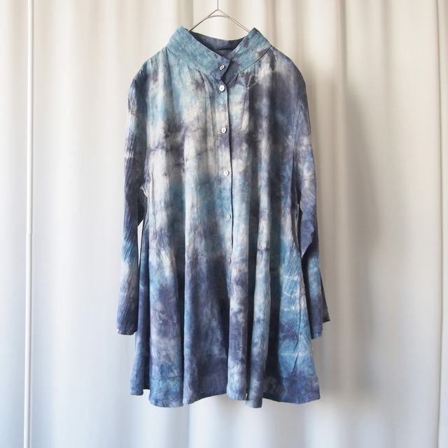 ジャガードスタンドカラーブラウス 草木染め(植物染料:インド藍、ロッグウッド) 【こちらの洋服について】 草木に囲まれた工房で、一枚一枚丁寧に手染めを施しました。自然な色合いと、手仕事ならではのやさしく奥行きのある風合いを大切にしています。 光を受けるとうっすらと模様が浮かび上がる、上品なジャガード生地を使用。首元までやさしく包み込むスタンドカラーで、落ち着いた印象に仕上げました。裾に向かって広がるシルエットが、身体のラインを拾わない、ゆったりとした着心地を叶えます。 【素材】綿100% 【サイズ(約)】着丈:80cm 身幅:55cm 袖丈:52cm 【お取り扱い方法】 ・中性洗剤でやさしく手洗い ・陰干し、直射日光を避けて保管 ・色移りを防ぐため単独洗い推奨 着るほどに色は落ち着き、布は身体に馴染んでいきます。 ※実物の色合いに合うように調整をしておりますが、お使いのデスクトップ環境によっては、画面の色味が実際の商品と異なる場合がございます。あらかじめご了承くださいませ。 *その他、生地の詳細やご購入にあたりまして記載事項をプロフィールまたは別ページにまとめてありますので、ご購入前に必ずご確認くださいませ。 https://shop.minenokoya.com/blog/2021/11/29/111219