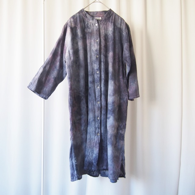 ジャガードピンタックロングブラウス 草木染め(植物染料:インド藍、ロッグウッド、コチニール) 【こちらの洋服について】 草木に囲まれた工房で、一枚一枚丁寧に手染めを施しました。自然な色合いと、手仕事ならではのやさしく奥行きのある風合いを大切にしています。 光を受けるとうっすらと模様が浮かび上がる、上品なジャガード生地を使用。ロングブラウスとしてほどよい丈感で、センターに施したピンタックが縦のラインを強調し、すっきりとした印象に仕上げています。ボタンを開ければ、軽やかな羽織りものとしてもお使いいただける一着です。 【素材】綿100% 【サイズ(約)】着丈:95cm 身幅:58cm 袖丈:52cm 【お取り扱い方法】 ・中性洗剤でやさしく手洗い ・陰干し、直射日光を避けて保管 ・色移りを防ぐため単独洗い推奨 着るほどに色は落ち着き、布は身体に馴染んでいきます。 ※実物の色合いに合うように調整をしておりますが、お使いのデスクトップ環境によっては、画面の色味が実際の商品と異なる場合がございます。あらかじめご了承くださいませ。 *その他、生地の詳細やご購入にあたりまして記載事項をプロフィールまたは別ページにまとめてありますので、ご購入前に必ずご確認くださいませ。 https://shop.minenokoya.com/blog/2021/11/29/111219
