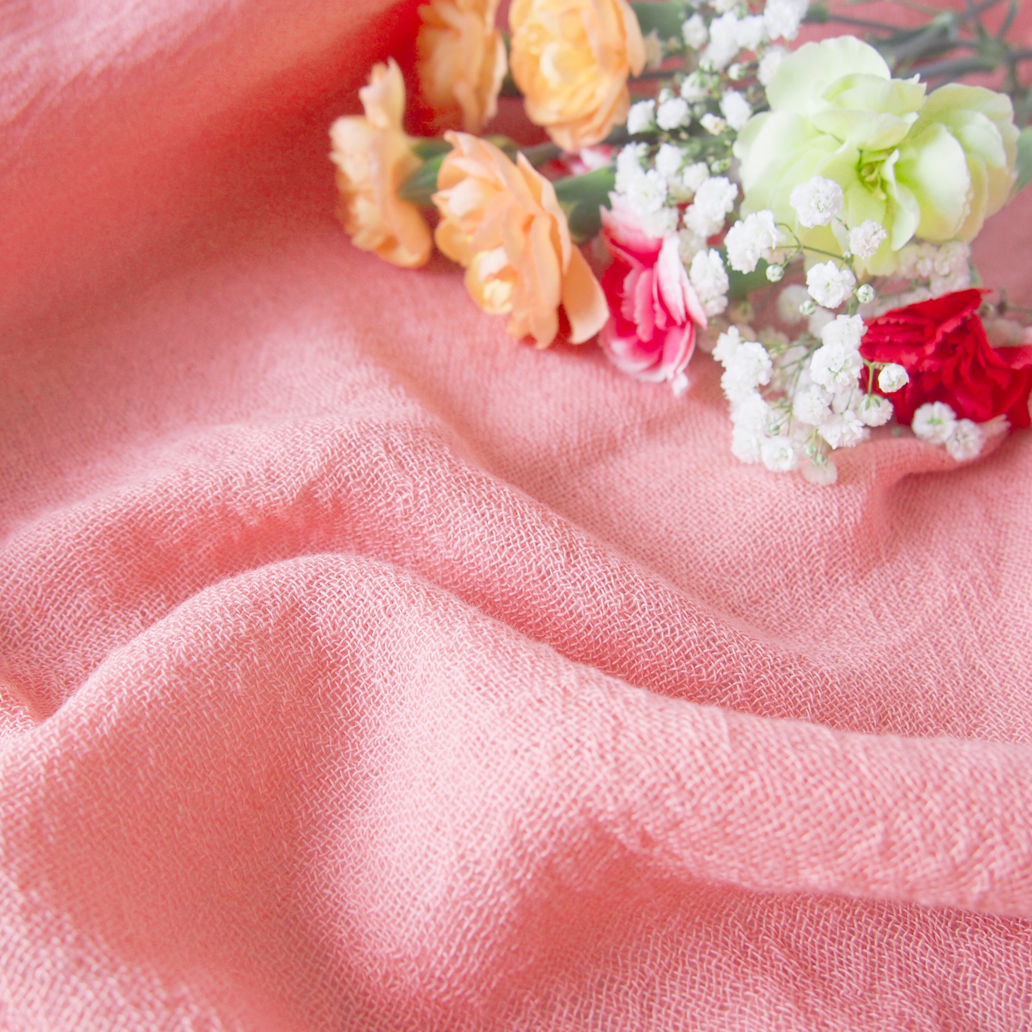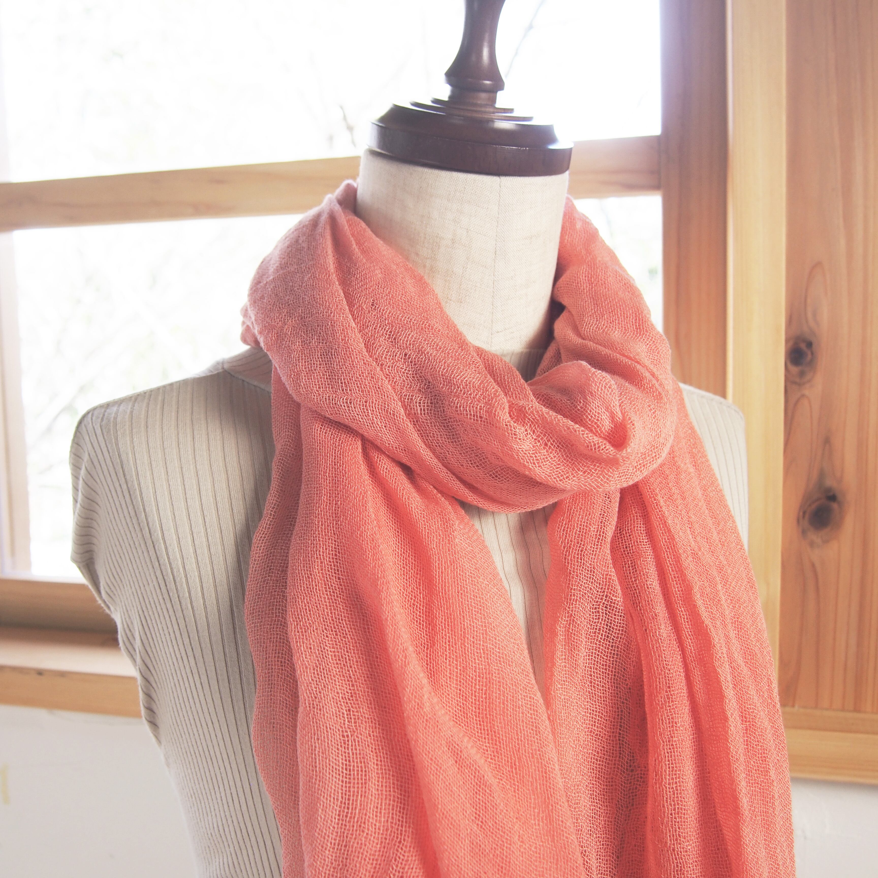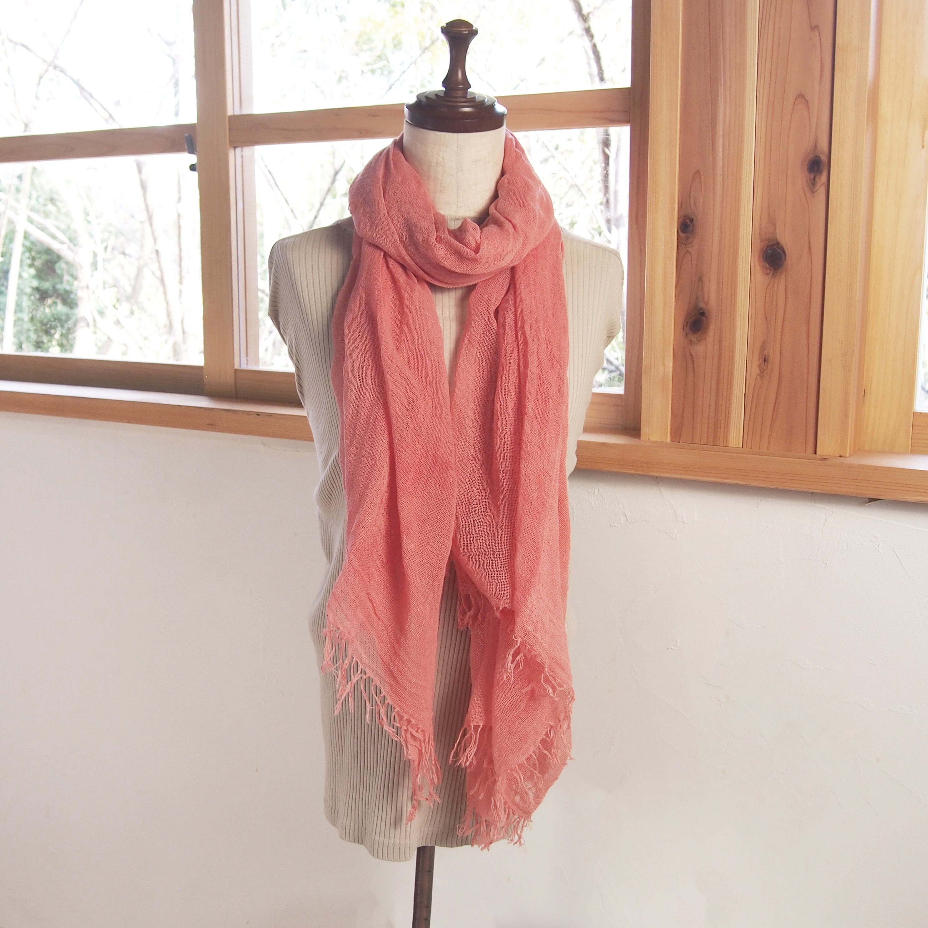 天然植物染料「インドアカネ」でやさしく染め上げた、顔まわりをふんわり明るく彩るストールをご用意しました。