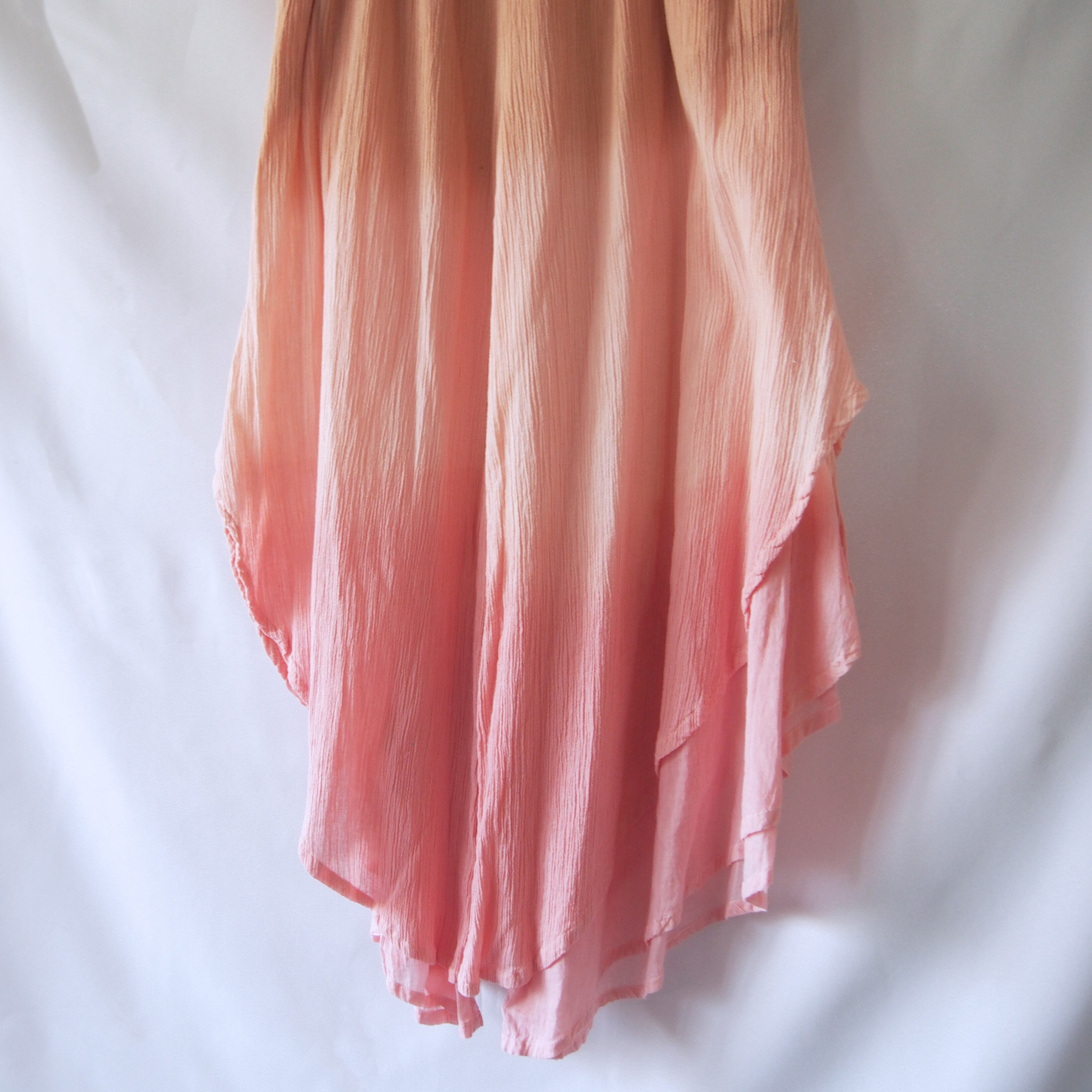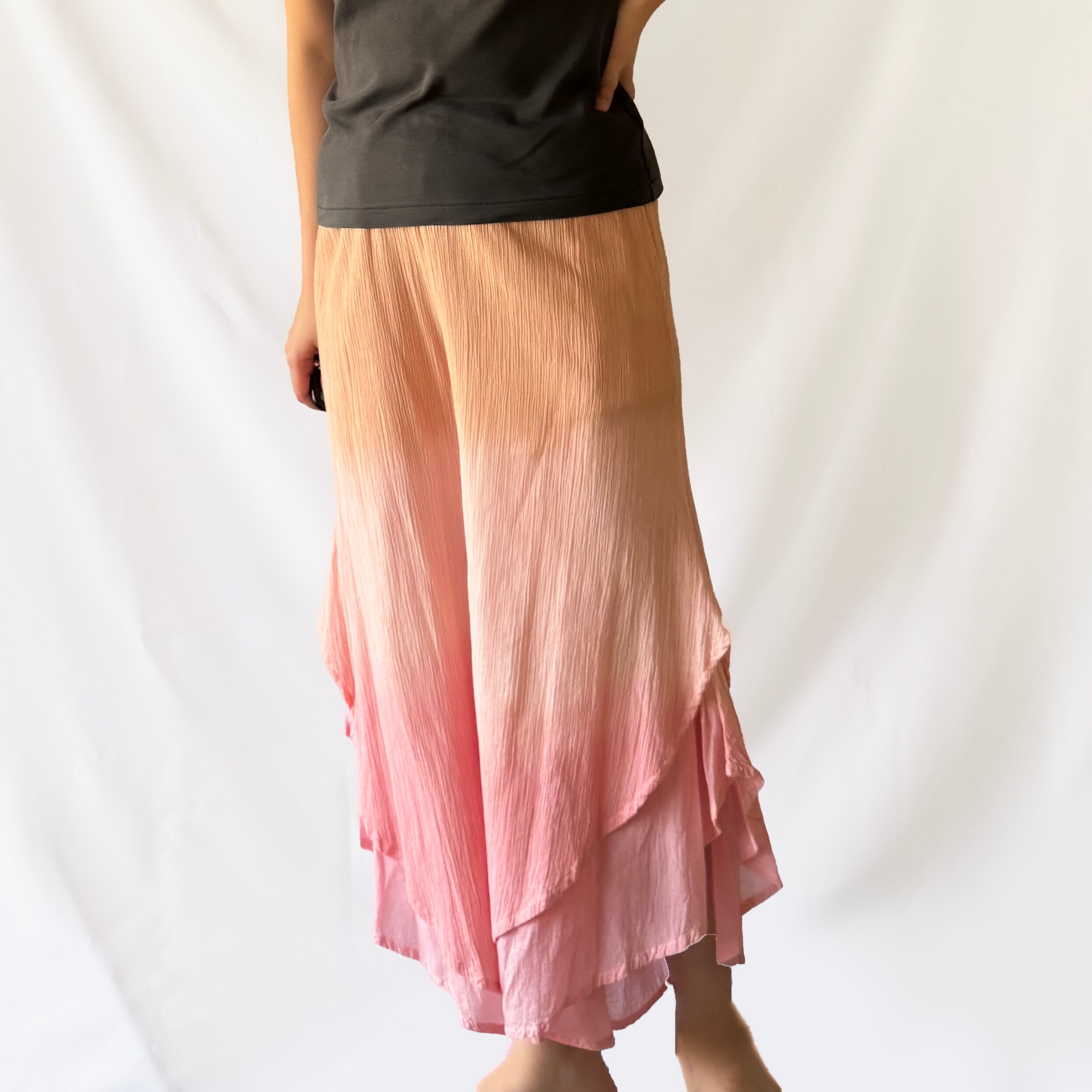 天然の植物染料を用いて「峯の小屋」にて一枚ずつ染め上げた、ワイドクレープパンツです。グラデーション状の奥行きのある色合いと唯一無二の模様は、手染めならではの味わい。自然の恵みをそのまま纏うような贅沢を、日々の装いにお楽しみいただけます。