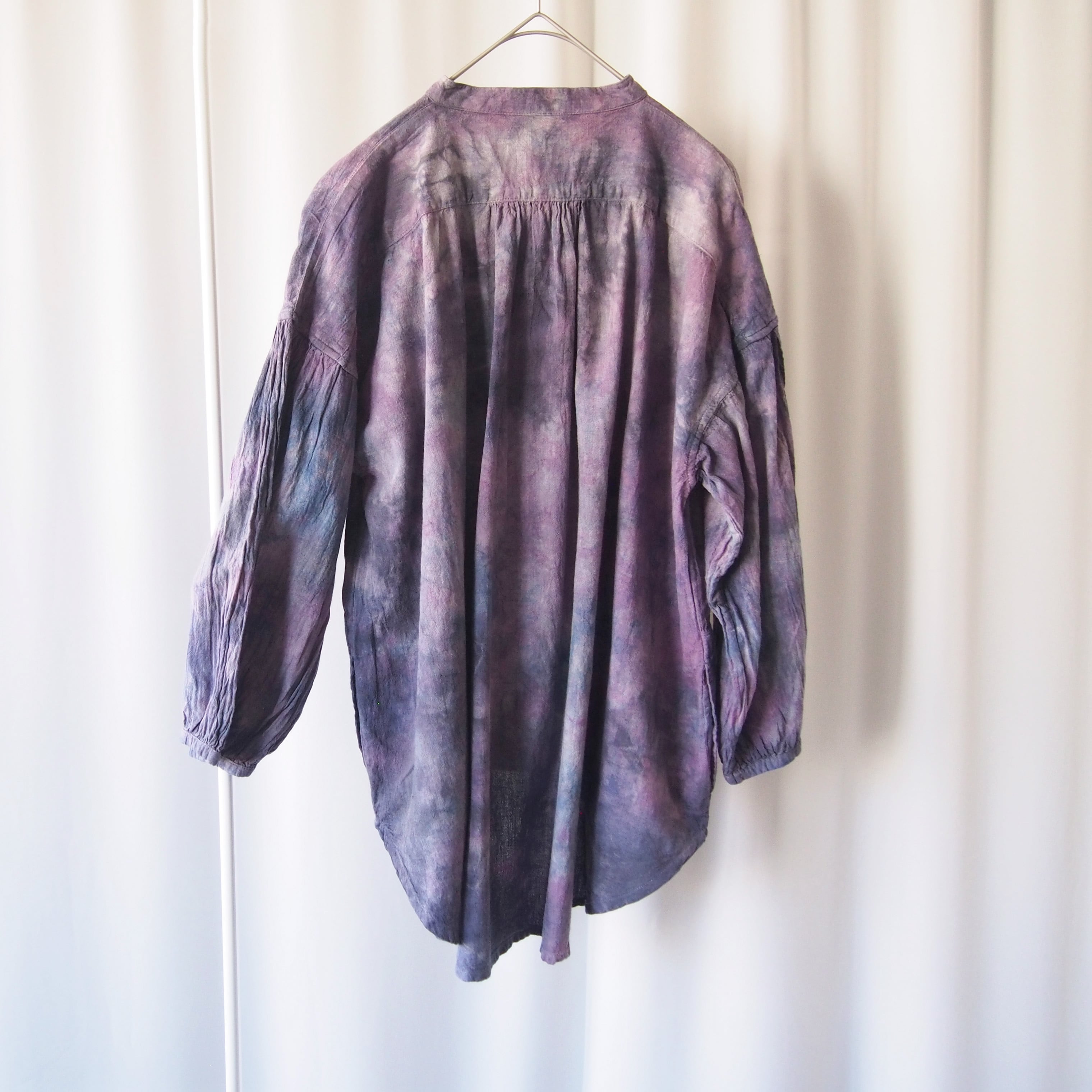 草木に囲まれた工房で、一枚一枚、丁寧に手染めで仕上げました。自然な色合いと、手仕事ならではのやさしく味わいのある風合いを大切にしています。