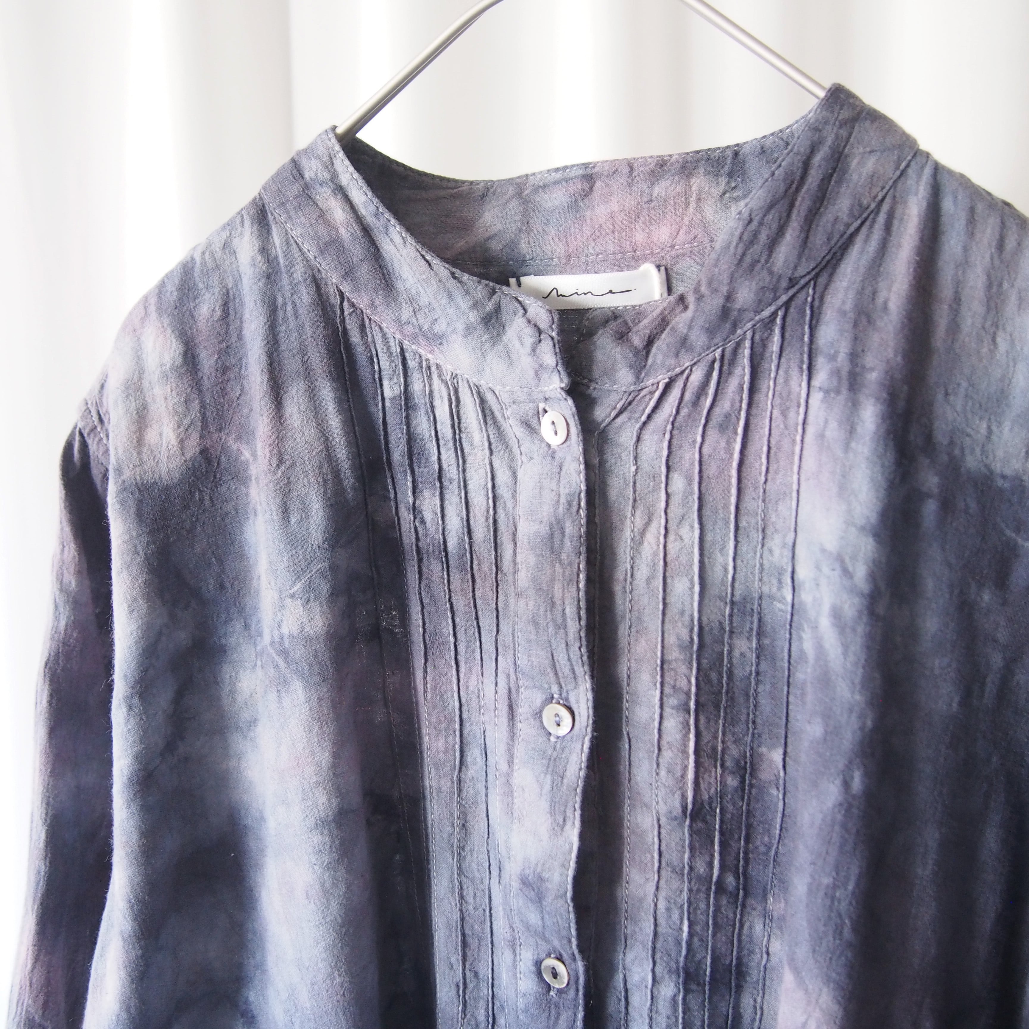 光を受けるとうっすらと模様が浮かび上がる、上品なジャガード生地を使用。ロングブラウスとしてほどよい丈感で、センターに施したピンタックが縦のラインを強調し、すっきりとした印象に仕上げています。ボタンを開ければ、軽やかな羽織りものとしてもお使いいただける一着です。