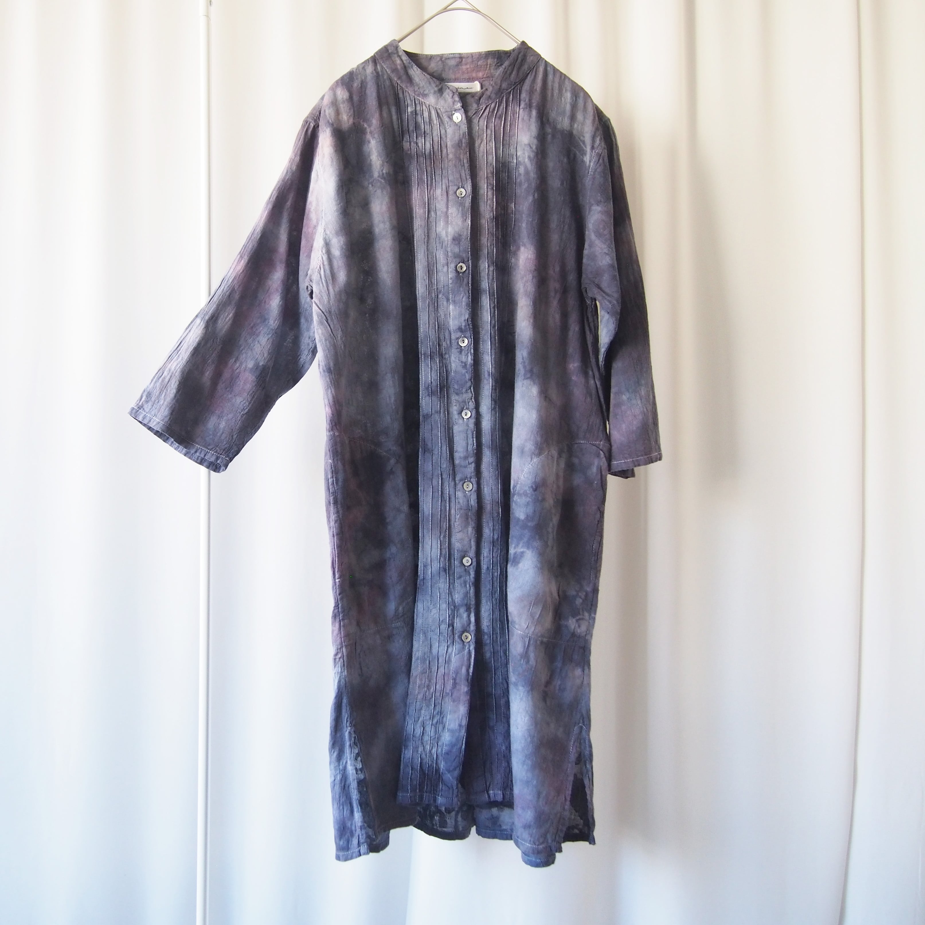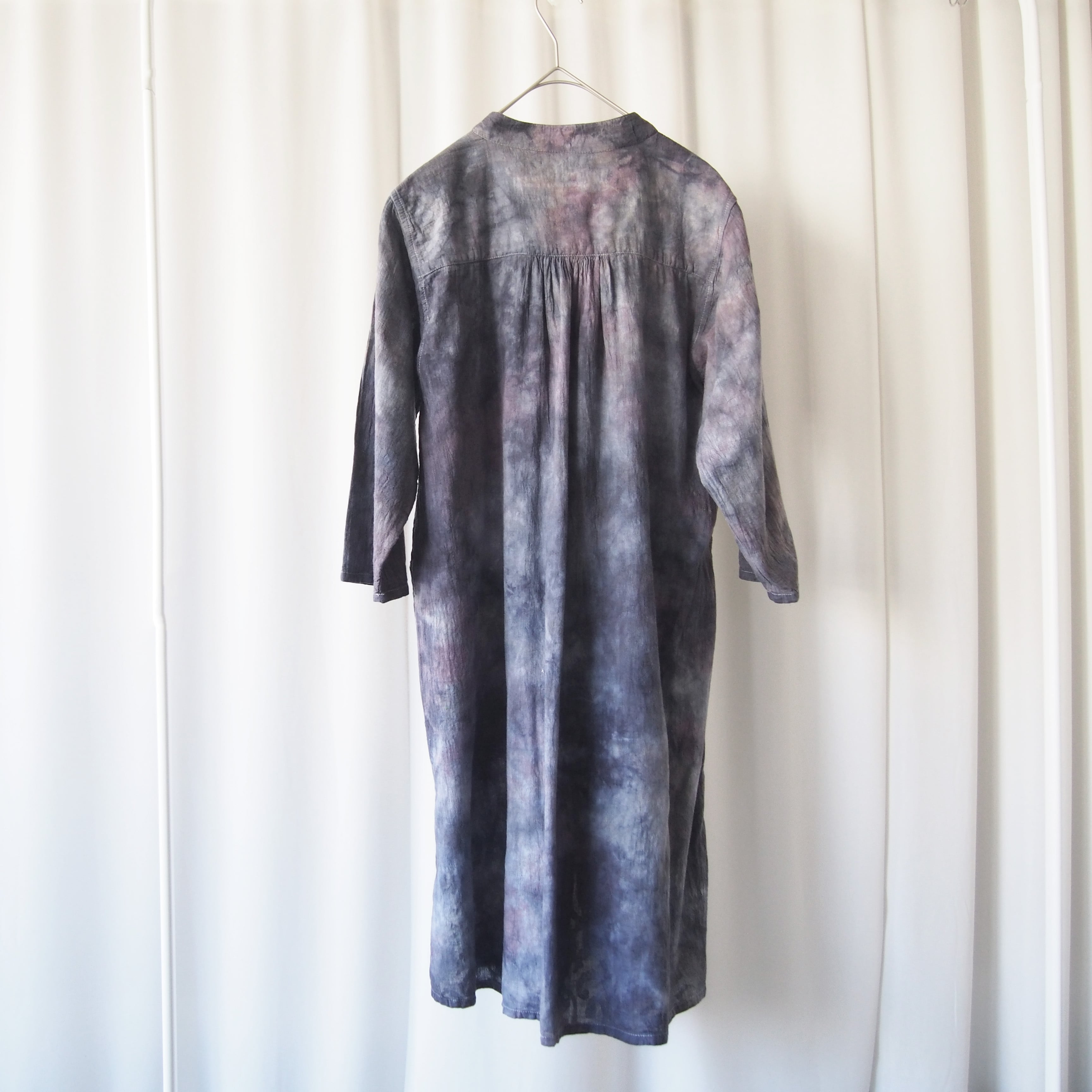草木に囲まれた工房で、一枚一枚丁寧に手染めを施しました。自然な色合いと、手仕事ならではのやさしく奥行きのある風合いを大切にしています。