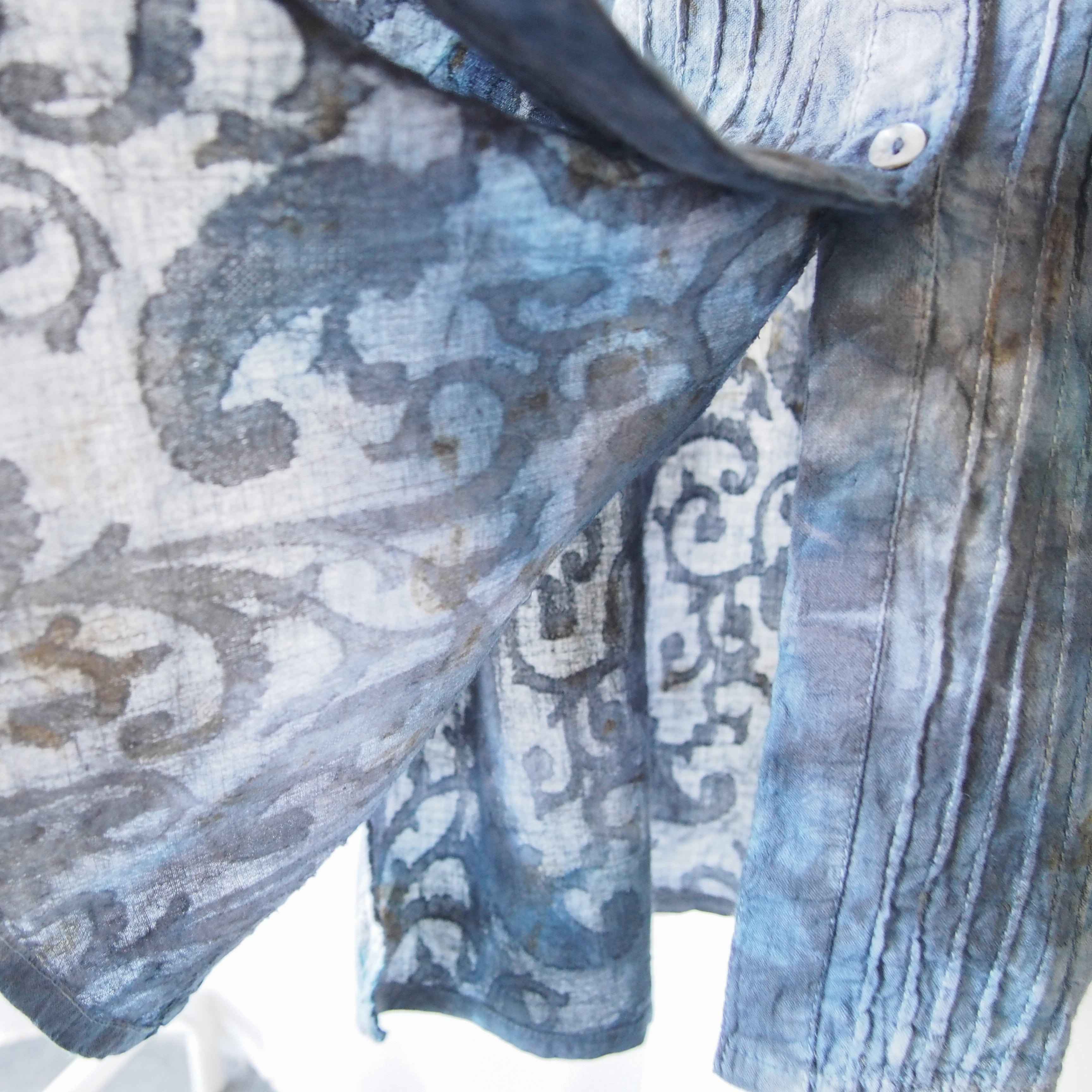 草木に囲まれた工房で、一枚一枚丁寧に手染めを施しました。自然な色合いと、手仕事ならではのやさしく奥行きのある風合いを大切にしています。光を受けるとうっすらと模様が浮かび上がる、上品なジャガード生地を使用。ロングブラウスとしてほどよい丈感で、センターに施したピンタックが縦のラインを強調し、すっきりとした印象に仕上げています。ボタンを開ければ、軽やかな羽織りものとしてもお使いいただける一着です。